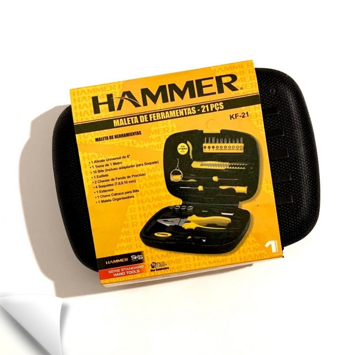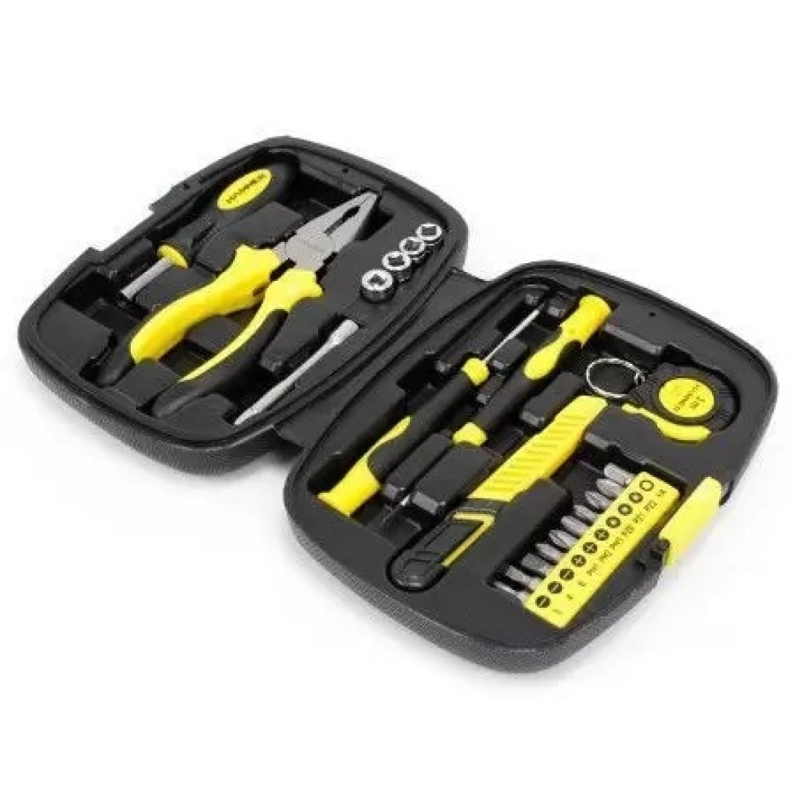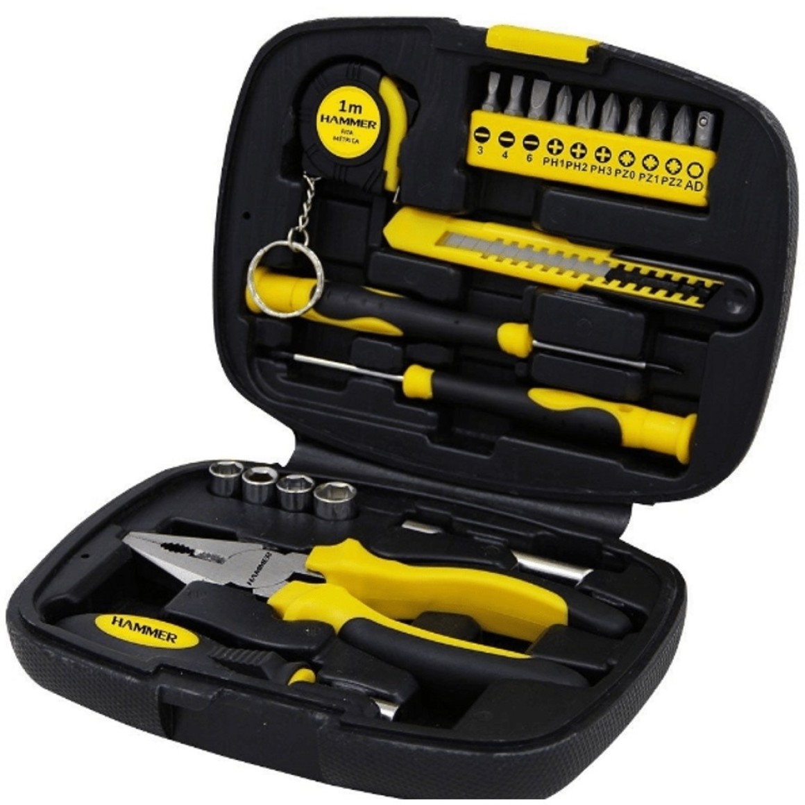 Contém: Alicate Universal 6"; Trena 1m; 10 Bits e adaptador p/soquete; Estilete; 2 Chaves de fenda precisão; 4 Soquetes (7,8,9,10mm); Extensor; Chave catraca p/Bits; Maleta Organizada